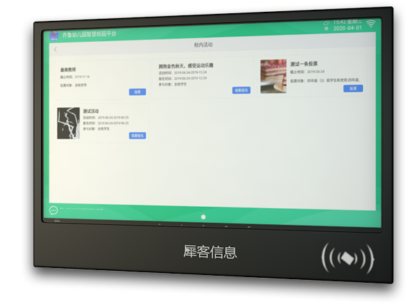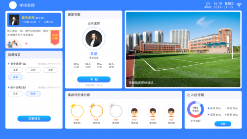 智慧班牌还能与校园一卡通、教务系统、校园环控系统、智能穿戴设备进行无缝对接,提供通过IC卡、人脸识别、二维码、指纹等多种方式实现对老师和学生的考勤功能,还可与学校环境监测传感器连接,实时显示学校的各项环境监测数据,并将这些数据汇总到后台进行多维度的统计分析,使智慧班牌真正成为学校实现物联网、大数据等信息采集的关键入口,也为学校的日常管理提供关键数据支撑。